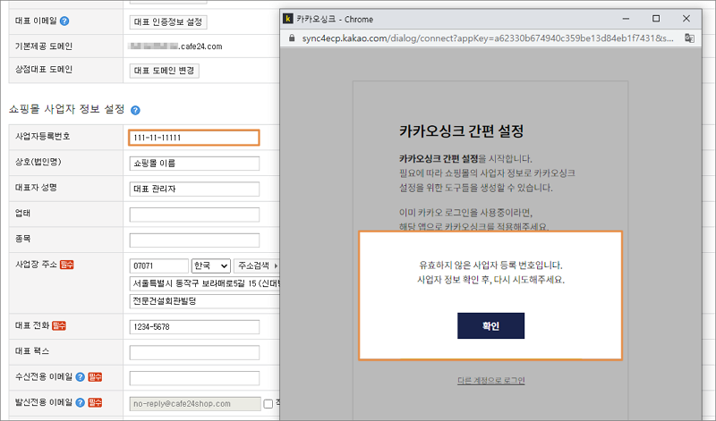사업자등록번호가 유효하지 않으면, 카카오싱크 서비스를 이용할 수 없어요.